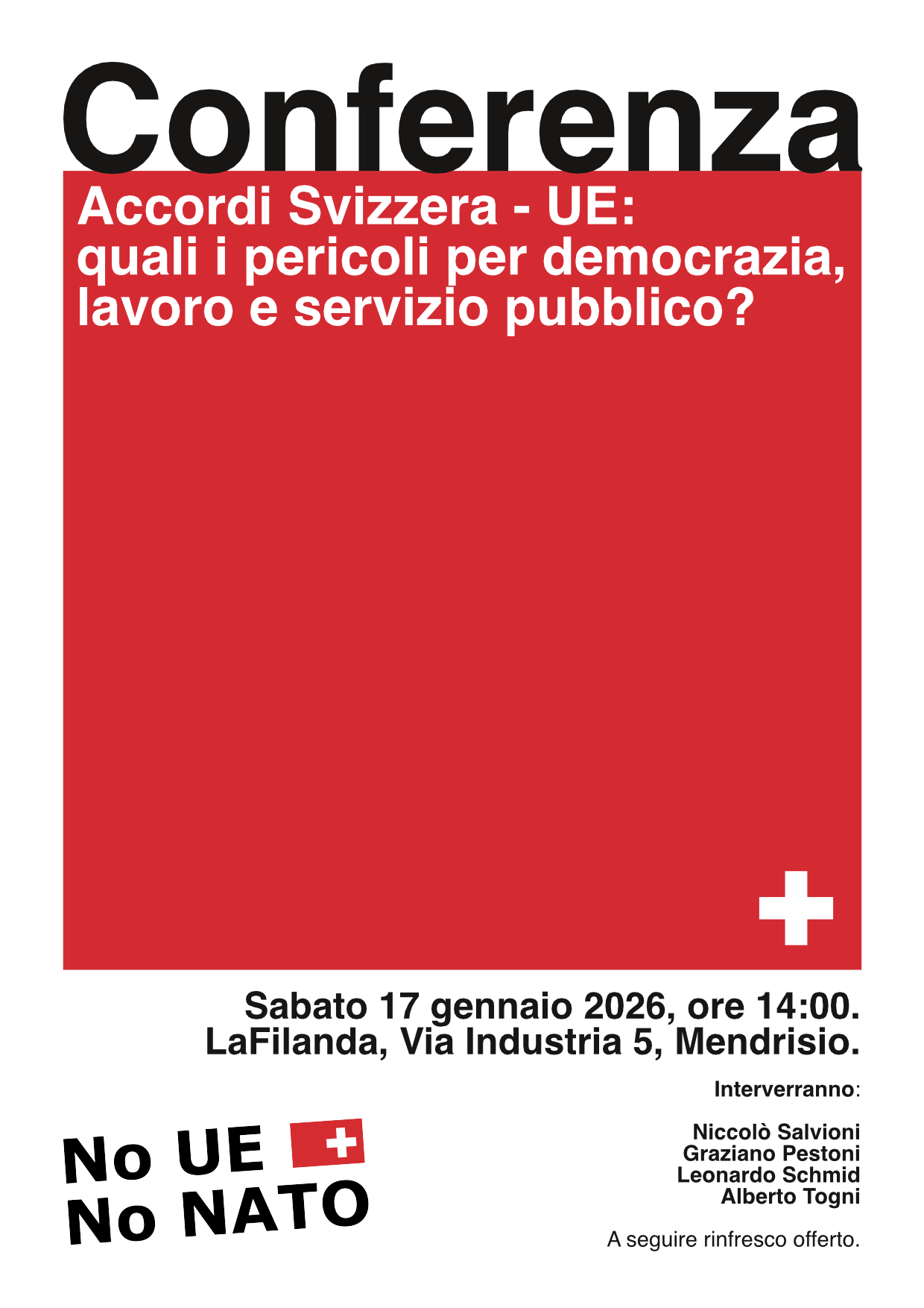 Sabato 17 gennaio alle 14:00, presso LaFilanda a Mendrisio, discuteremo delle ripercussioni che il nuovo pacchetto di accordi Svizzera-UE avrà sul nostro sistema politico-istituzionale, sul servizio pubblico (dal mercato energetico ai trasporti, senza dimenticare la questione degli aiuti di Stato) e sulle tutele dei lavoratori, (ma non solo).